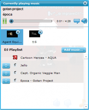 • You can become a DJ in a room by adding a song to the room from your Stuff tab. If the room is already in DJ mode, you can add a song by clicking on the orange note in the lower right of the room for the music player and click on the "Add music..." button.