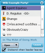 On the list of players, the player at the top, highlighted in dark blue, is the party leader. The names show up in the order that they joined the party. If you are the party leader, you can use this window to change the party options (open, group, closed). If you are not the leader, this option will be greyed out.