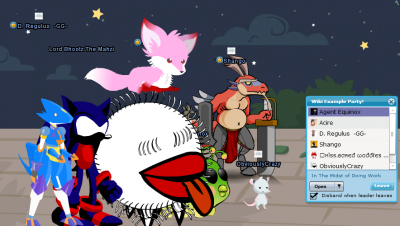 You can create and join parties of people roaming the Whirled. All the players in the party will automatically follow the party leader as the leader moves from room to room. This is especially fun when playing AVR games like Ghosthunters or Psychic Challenge. Parties are a beta feature currently under development.